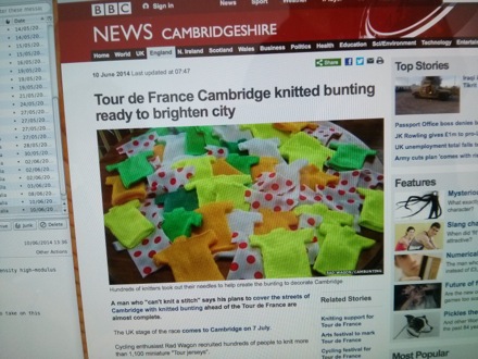 Many people in Cambridge are knitting these - they will be joined together to form bunting as the cycles will race through Cambridge |