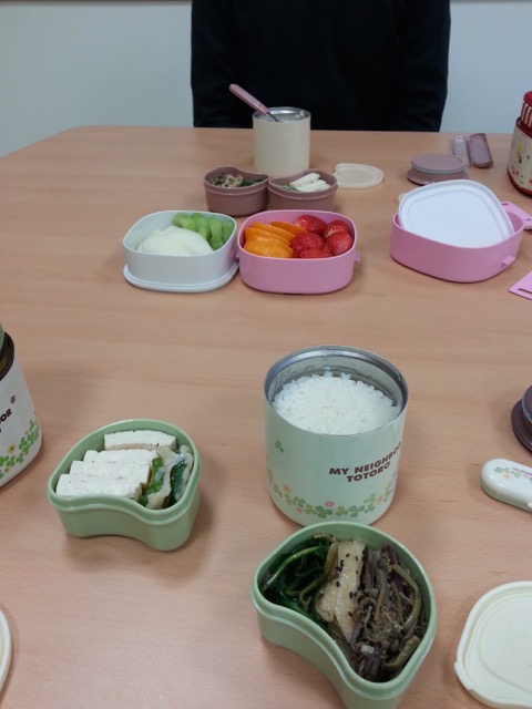 The food was kindly prepared by Yon Park. Note that the rice is presented in an appropriate thermos flask to keep it warm. The food consisted of rice, a mixture of vegetables, torfu, and four different kinds of fruits including kiwi, strawberry, melon and orange. |