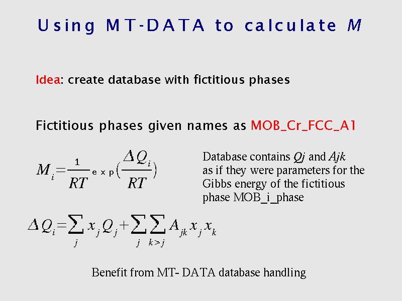 A number of recent studies have focussed on creating databases for the mobilities of elements in different phases, using a CALPHD-type approach.