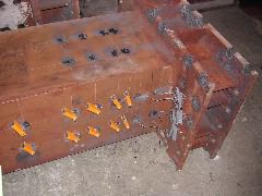 Beams with reinforcement bars ready for encasement in concrete prior to testing.
