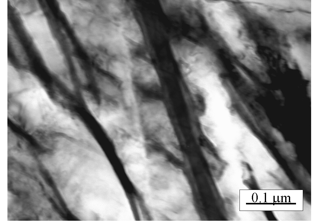 Fe-0.78C-1.49Si-1.95Mn-0.24Mo-0.97Cr-0.97Co-0.99Al wt% Austenitised at 900°C for 30 min. isothermally transformed at 250°C for 24 h.