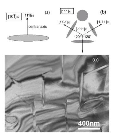 This figure shows the lenticular-shaped Ni4Ti3 precipitates with a central plane parallel to the crystallographic {111} B2 planes of the B2 matrix via conventional bright-field transmission electron microscope observation. There are 8 variants of Ni4Ti3 precipitates in total, but since two variants share the same central plane, only four different orientations are observed in a scanning electron micrograph as is shown in the scheme. |