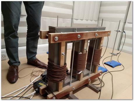 Electrical transformers make a humming noise. This is an anechoic chamber where detailed measurements of the noise are used to optimise transformer construction.