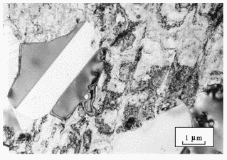 | Shows a recrystallised grain which is relatively free of dislocations, surrounded by a deformed matrix which has a high dislocation density. The recrystallised grain contains annealing twins (parallel bands with different contrast). |